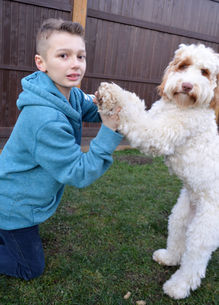 Highly intelligent and creative, Clover thrives on outdoor adventures and excels at dog agility, confidently navigating obstacle-style games that include tunnels, poles, and learning new tricks. She has a gentle soul in a wonderfully sturdy body, adores belly rubs, plays joyfully in the snow and has even pulled children on sleds or trotted happily alongside bikes. Now retired from Chilliwack Labradoodles, Clover has produced exceptional puppies and as a proud great-grandma, her consistent temperament and soft, loving nature continue beautifully through the guardian-home dogs retained from her lineage.