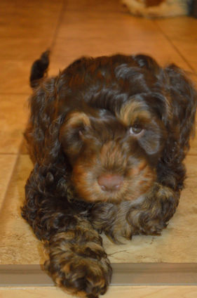 Sakura comes to us from Alpine Labradoodles, we are so grateful to have this devoted little girl as part of our family and breeding program. Our Mini Teddy Bear for sure she has such a soft fleece coat with our favorite Chocolate Phantom coloring, and eyes that melt into your own! This girl is oh so clever, she learns quickly and is attentive to your needs. She can keep up to her two medium size sisters and can outwit them at many a turn. Sakura has the sweetest and sometimes saucy sense of humor when she plays and teases it is so entertaining to watch. She loves the outdoors; a walk, hike or a great game of fetch. If you say the word car ride this girl gets excited! She's happy to be invited on any adventure you take her. She is great with animals and people alike, she loves kids and they adore her. We cannot wait to see her distinguished little pups.